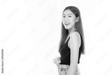 Portrait beautiful slim woman expressing astonishment and amazement, stretch jeans and happy of weight lost, standing over isolated on white background. Pretty young female get success of lost weight