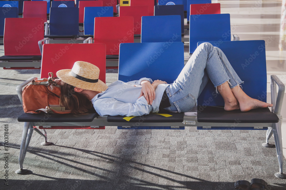Tired tourist woman sleeping on the seats in the waiting area while waiting for the fligh at the empty airport. Missed flight, flight delay or cancelation concept.
