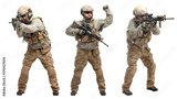 soldier in military equipment with a gun on a white background, a commando in uniform with a gun to aim and attack