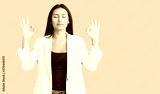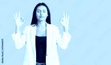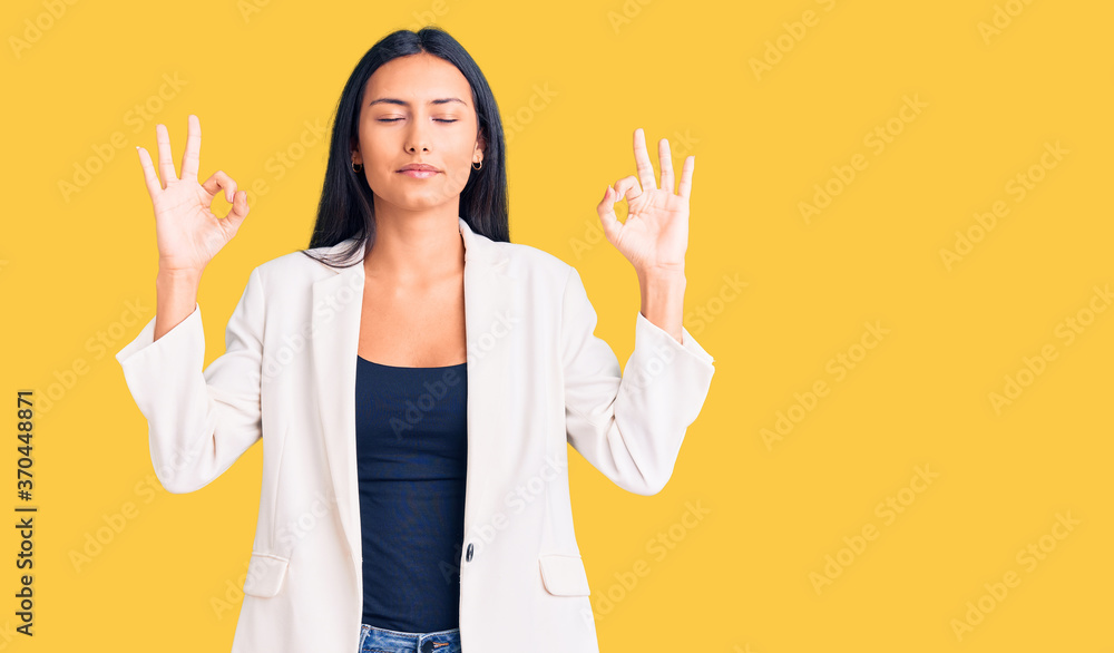 Young beautiful latin girl wearing business clothes relax and smiling with eyes closed doing meditation gesture with fingers. yoga concept.