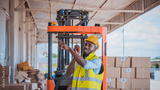 Portrait worker industry factory wear safety uniform factory drive a forklift car to control goods production work in factory plantation by radio communication for another worker.