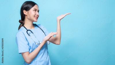 Portrait of young Asian beautiful nurse in blue uniform and wearing a surgical mask for protection from covid19 or disease with big smiled inside pointing and present on copy space blue background