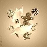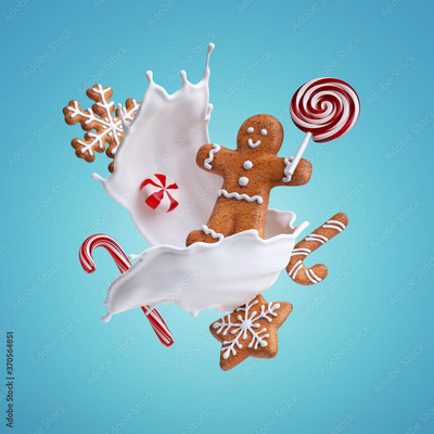 3d rendering of milk splash, gingerbread cookies and caramel candies isolated on blue background. White splashing liquid wave and sweets levitate. Christmas food illustration