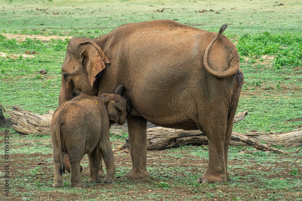 Mother elephant suckling its baby. Udawalawe, Sri Lanka