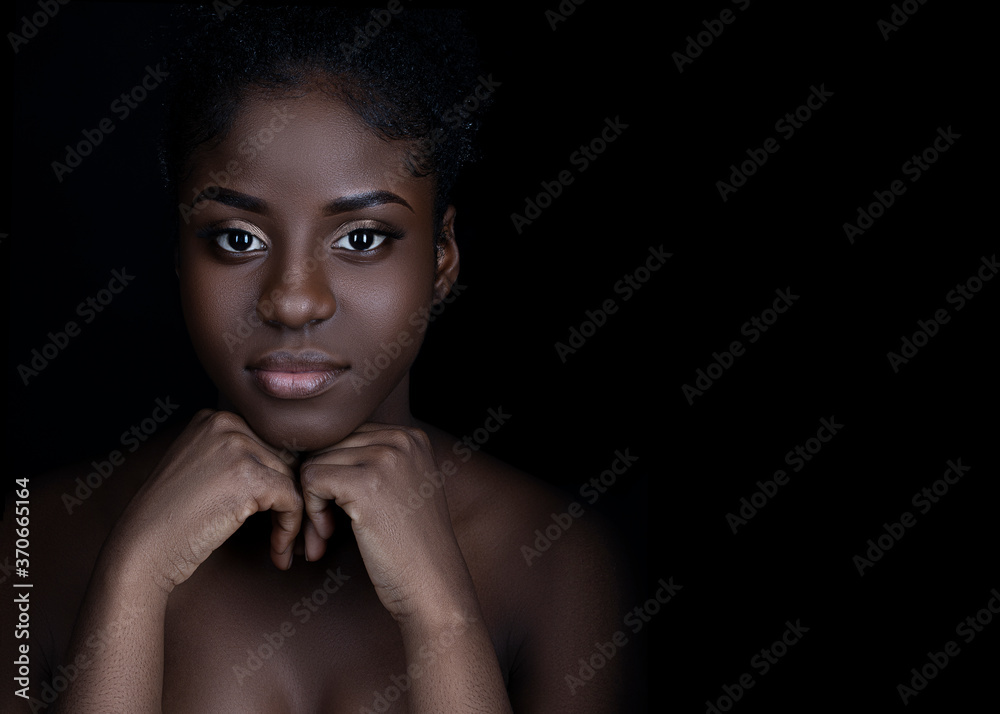 close up of beautiful young black woman with beautiful skin and makeup looking at camera