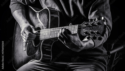 Music concept. Guitar acoustic. Play the guitar. Live music. Music festival. Instrument on stage, band. Electric guitar, guitarist, musician rock. Musical instrument. Guitars, strings. Black and whit