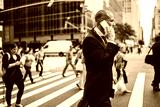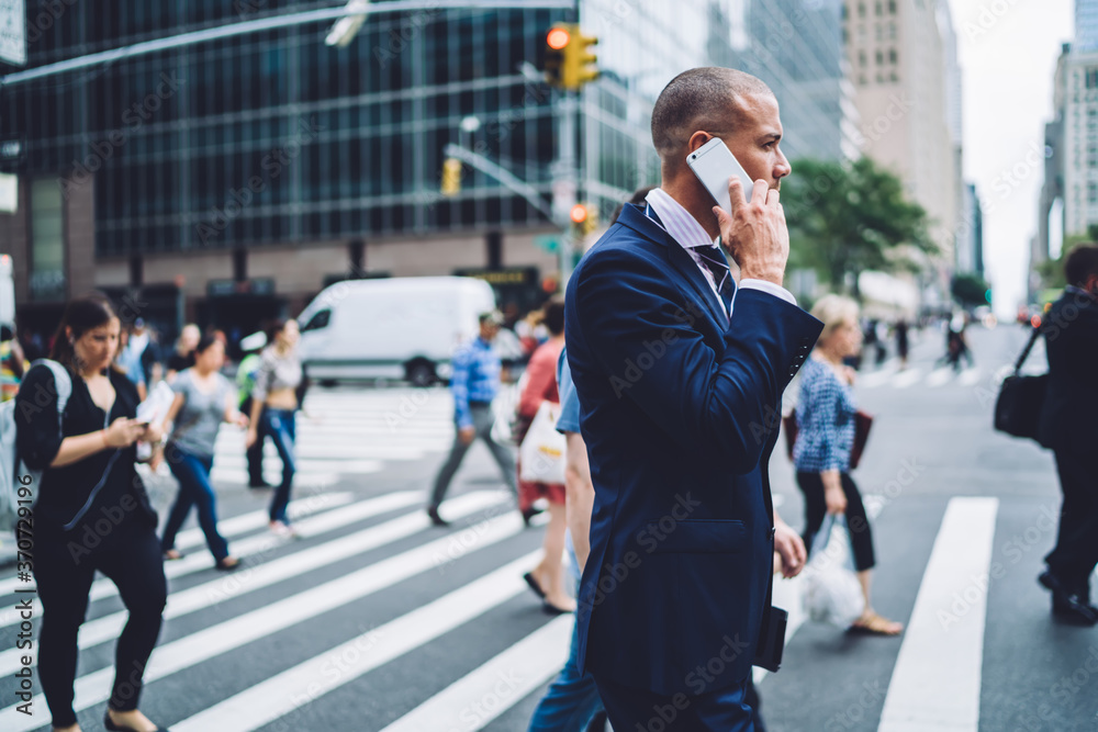 Confident executive manager in elegant suit talking with banking service operator on phone walking on crosswalk, serious owner having mobile conversation about business strolling on crowded street