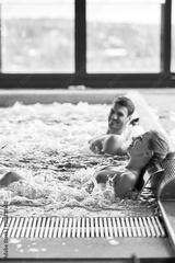 Happy couple relaxing during water massage in swimming pool at wellness.