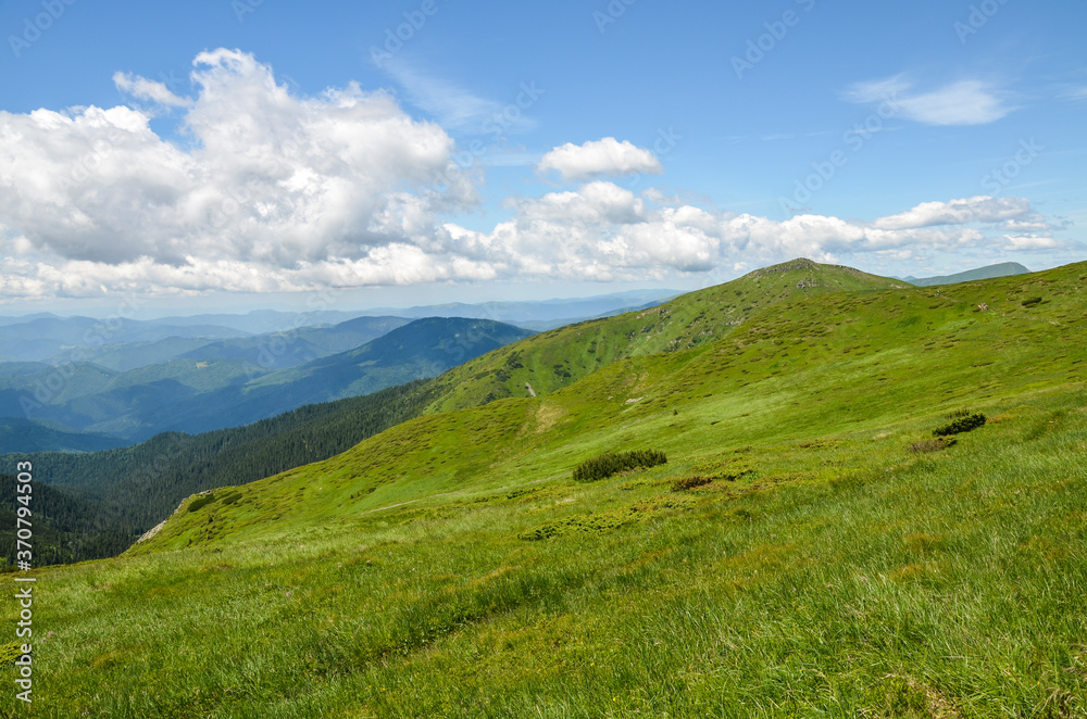 Green grassy hillsides of the Chornohora ridge under a blue cloudy sky. Summer landscape of the Carpathian mountains.