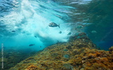 Wave breaking on rock underwater with seabreams fish, Mediterranean sea