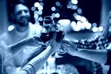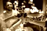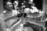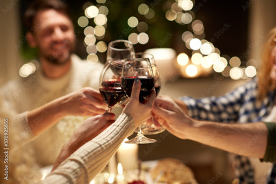 holidays, celebration and people concept - happy friends having christmas dinner at home drinking non-alcoholic red wine