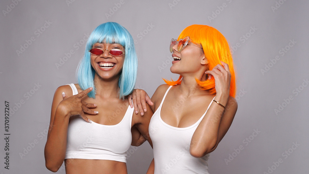 Portrait of two beautiful happy Asian women friends in bright blue and orange wigs and sunglasses posing over gray background