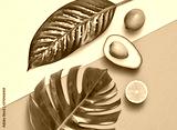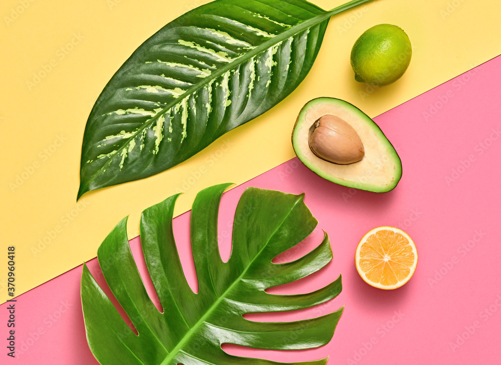 Tropical Palm Leaf and Fresh Fruits. Vegan Colorful Flat lay. Summer Design Set. Trendy Fashion concept. Creative Bright tropic citrus fruit background. Summertime color mood