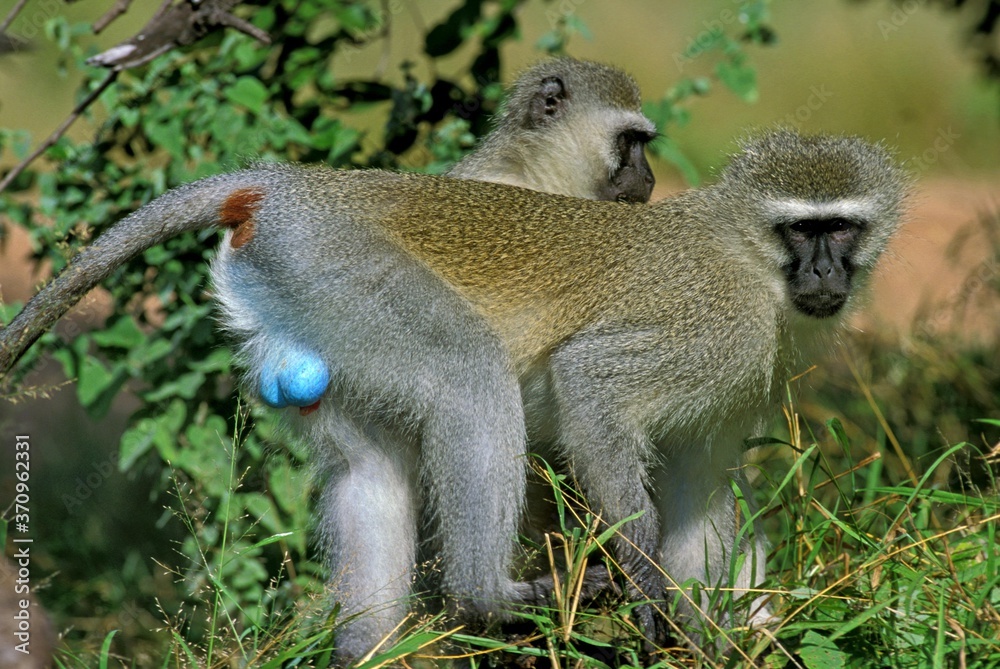 Vervet Monkey, cercopithecus aethiops, Pair standing on Branch, Kruger Park in South Africa