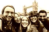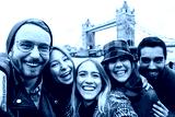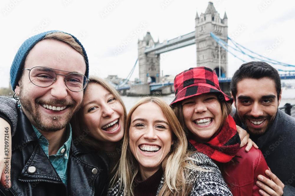 Happy friends taking selfie photo in london with Tower Bridge in background - Young people having fun with technology trends - Travel and friendship concept - Main focus on left guy face