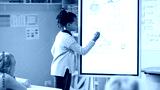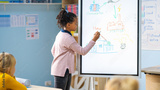 Elementary School Science Class: Portrait of Cute Girl Uses Interactive Whiteboard to Show to a Classroom full of Classmates how Renewable Energy Works. Science Class, Kids Listening.