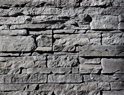 Dark gray stone wall made of natural rocks of different sizes. Background and texture