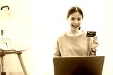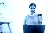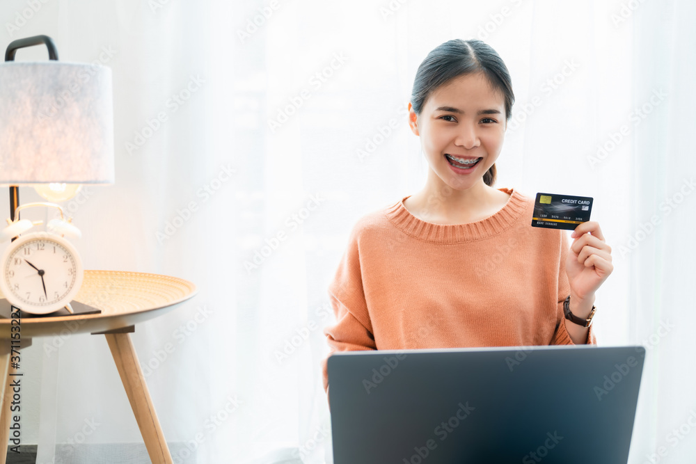Beautiful Asian woman holding credit card and using digital laptop with shopping online for banner size with copy space advertisement background.