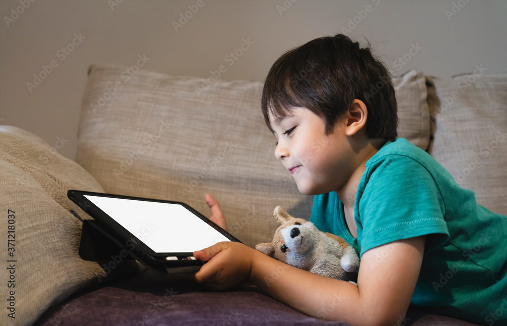 Cropped shot kid lying on sofa watching cartoons on tablet,6-7 year old boy playing game on touch pad, Children having activity on his own with mock up of digital tablet.New normal education