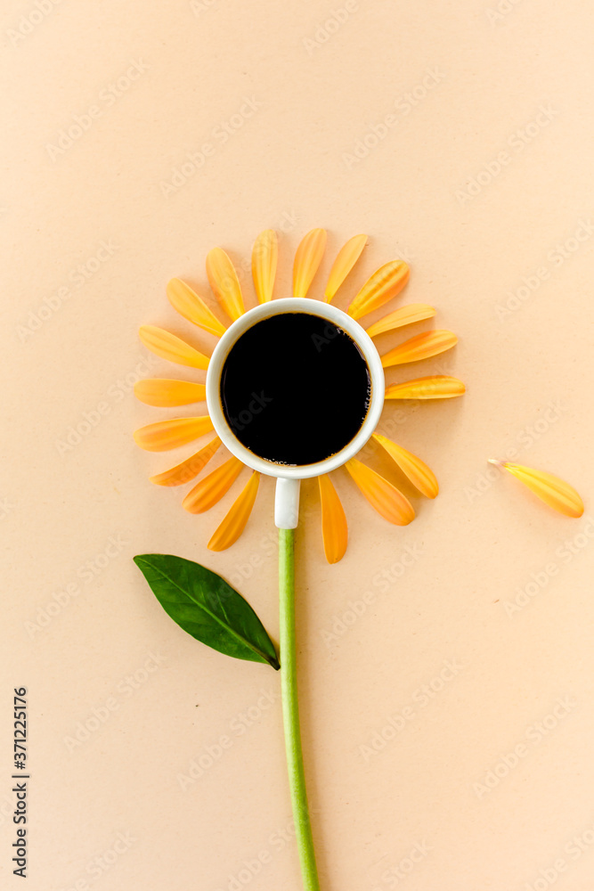 Cup of coffee and flower petals on a beige background. Flat lay, top view