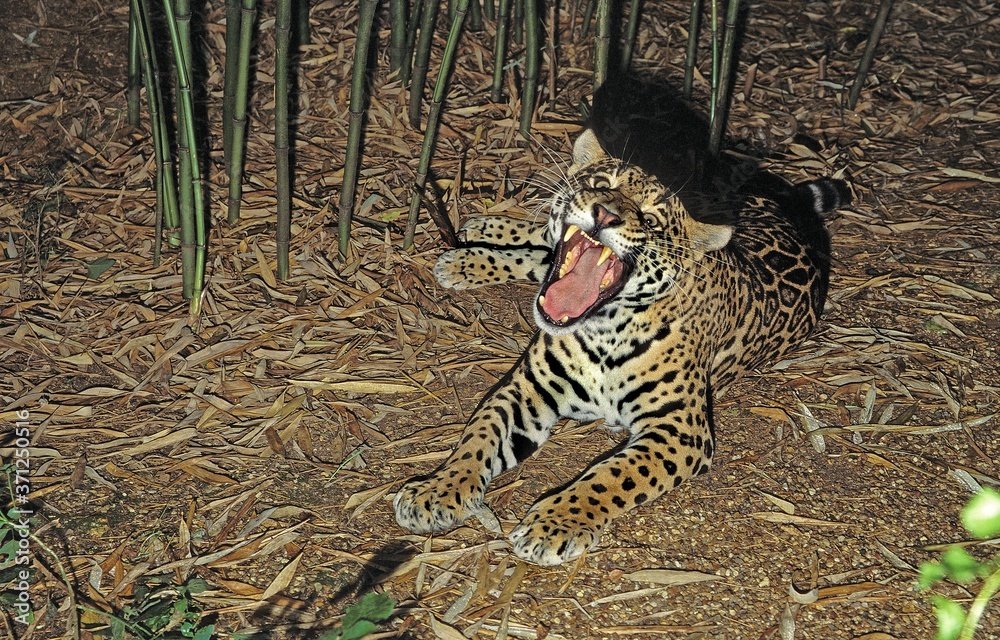 Jaguar, panthera onca, Adult with open Mouth, in Defensive Posture