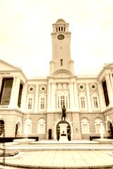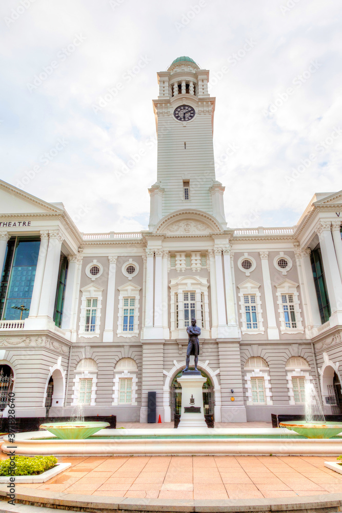 Victoria Theatre and Concert Hall in Singapore is a colonial-style historic building in Singapore with the statue of founder Stamford Raffles in front of the clock tower.