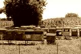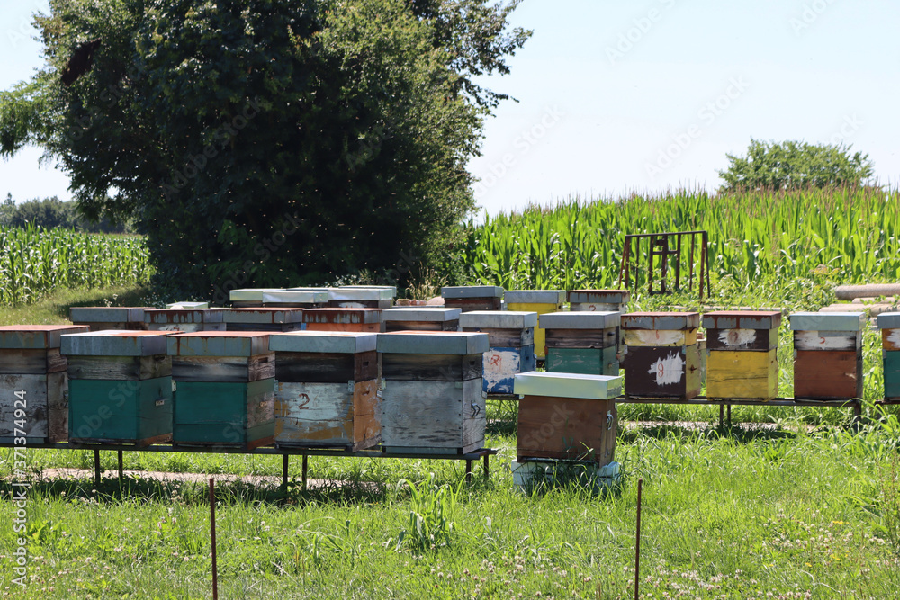 Many colorful beehives in a row near a corn field on a sunny day