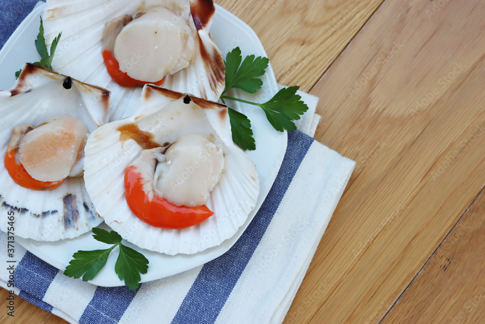 Fresh shell scallops on a plate with green parsley on a wooden table. Pecten jacobaeus