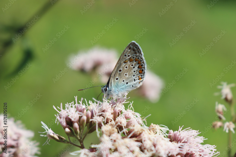 Male Polyommatus icarus butterfly on a bunch of pink flowers in the garden. Common blue butterfly