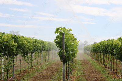 Water irrigation system in function on a green vineyard on summer season in the italian countryside