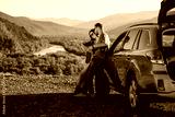 Travelers Couple on a Road Trip, Man and Woman Using Map on Journey Near Their Car Over Beautiful Landscape