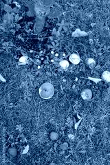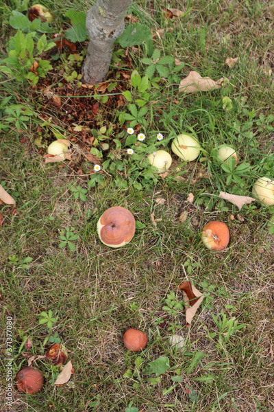 Rotten apple fruits under the tree in the orchard. Apple cultivation on summer. Malus domestica