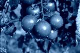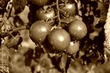 Fresh rep italian Camone tomatoes on plant covered by water drops in the vegetable garden on summer. Solanum lycopersicum cultivation