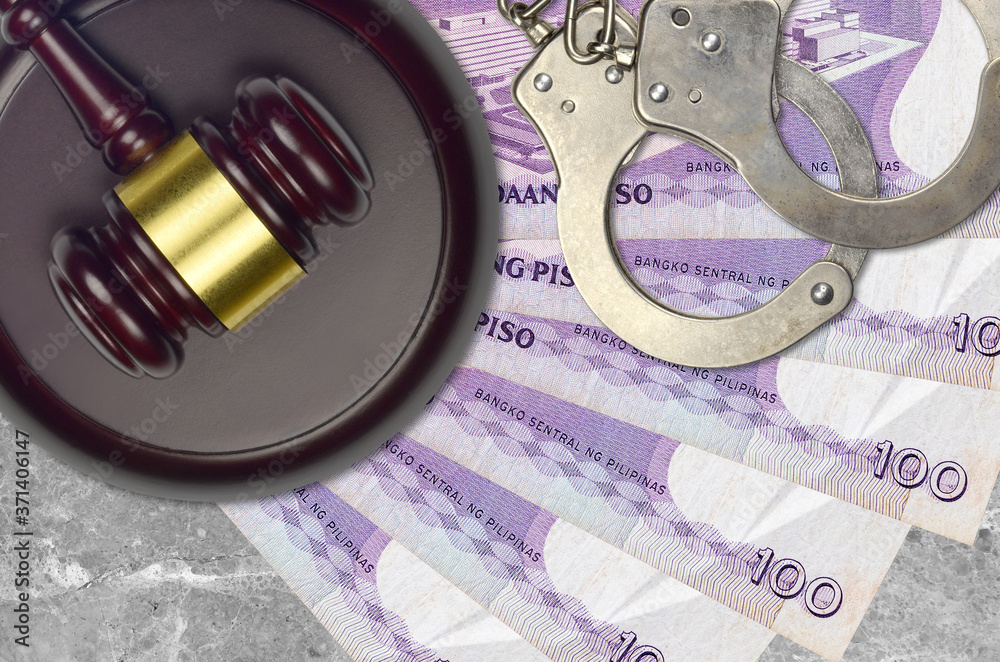 100 Philippine piso bills and judge hammer with police handcuffs on court desk. Concept of judicial trial or bribery. Tax avoidance