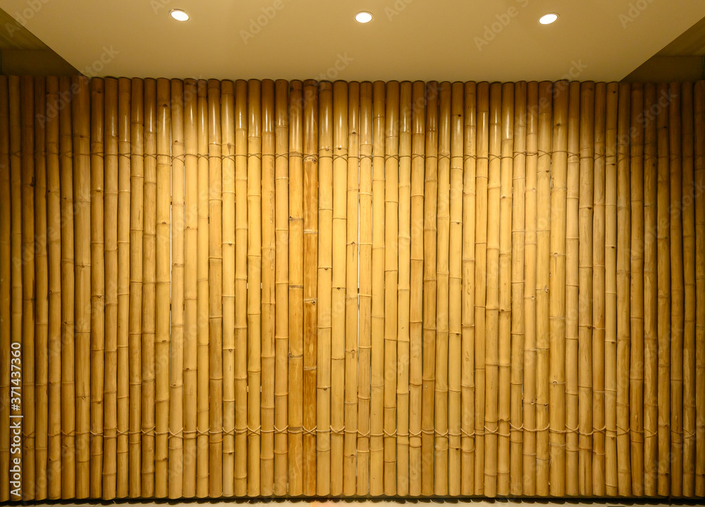 background and texture of decorative yellow bamboo wood on finishing wall surface.