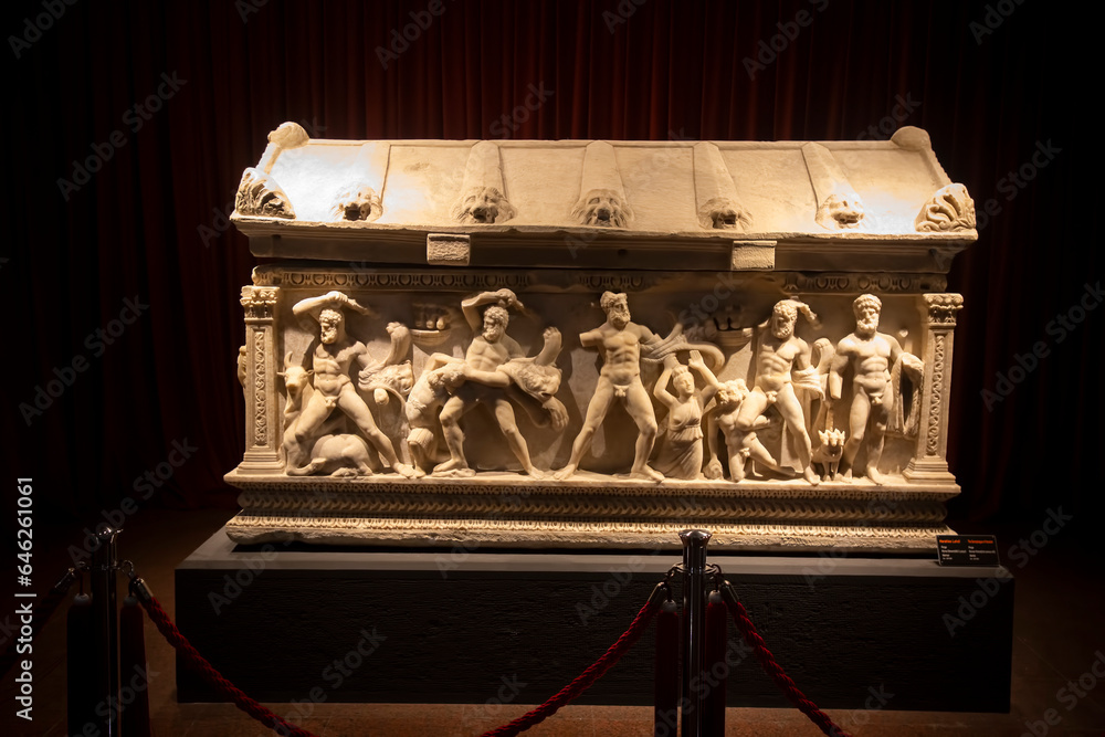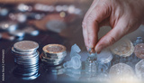 Selective focus hand of businessman moving chess knight competition, Business leader and confrontation solve problems concept, Chess horse on board with copy space
