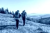 Two elderly people with large backpacks to hike through the autumn mountains, concept of active recreation in old age