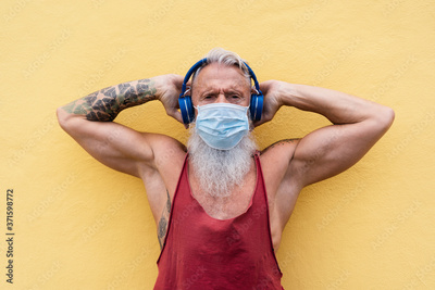 Senior athlete man wearing face medical mask for coronavirus prevention while listening playlist music - Mature tattoo guy after workout training during Covid 19 outbreak - Sport and gym concept