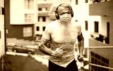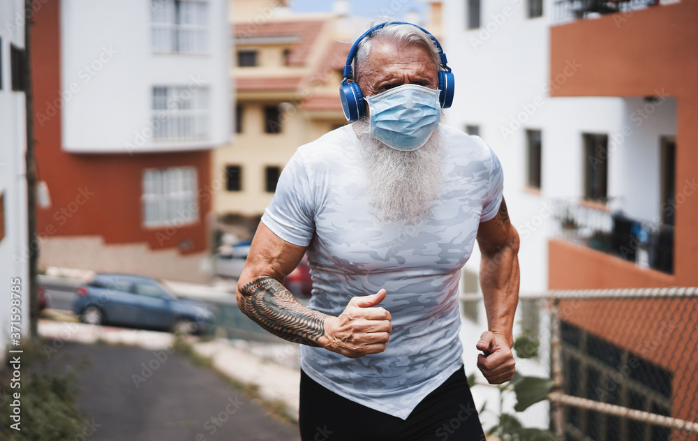 Senior man running outdoor while wearing face protective mask - Mature male doing jogging listening music with headphones during Coronavirus outbreak - Sport and fitness concept - Focus on face