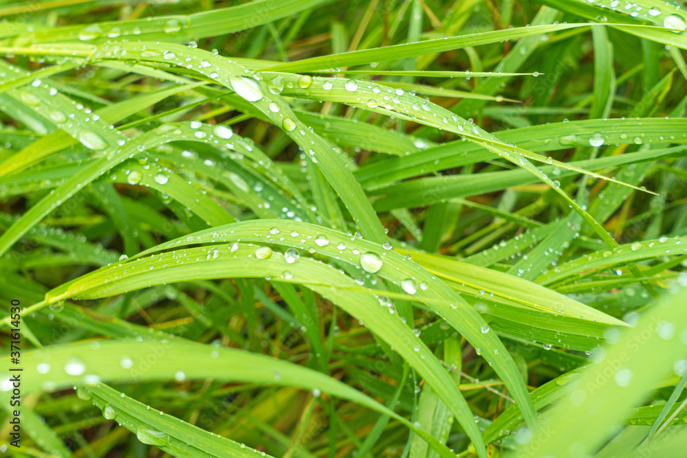 water drops on grass, summer day, green background