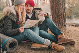 Travel couple camping with map in the forest. Concept of trekking, adventure and seasonal vacation.