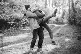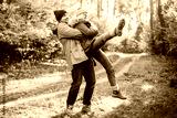Traveler couple in love so fun in the forest. Concept of trekking, adventure and seasonal vacation.