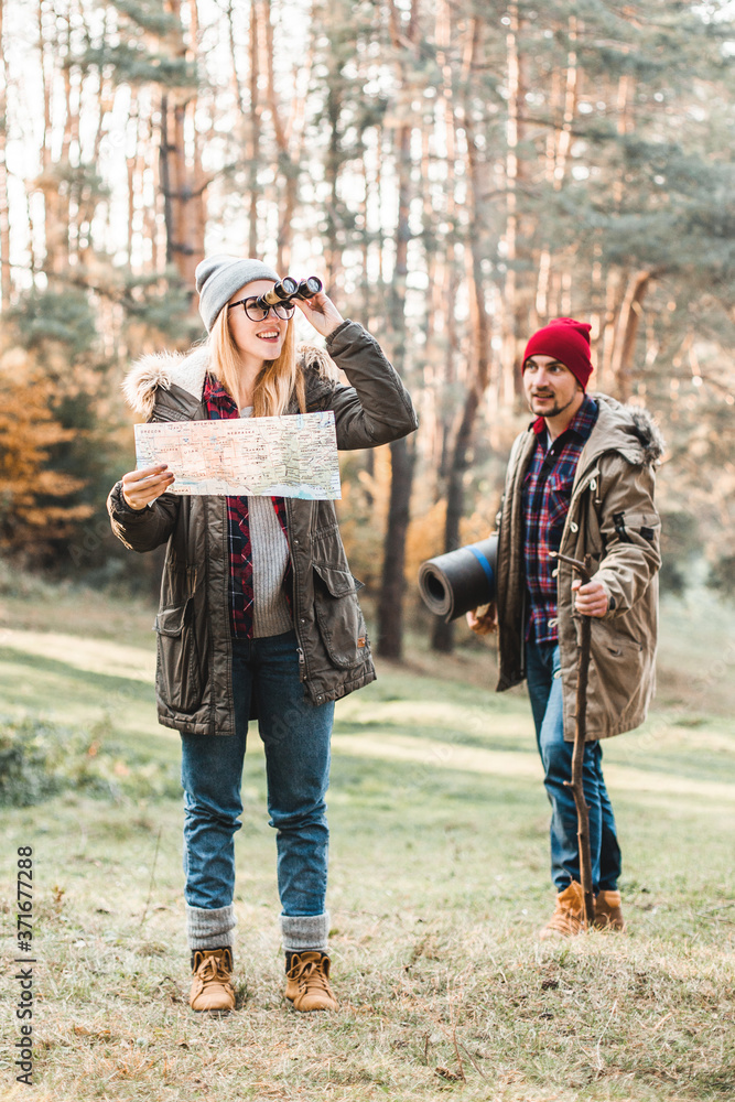 Travel couple with map, compass and backpack in the forest. Freedom and active travel concept.