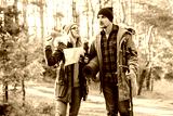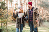 Travel couple with map, compass and backpack in the forest. Freedom and active travel concept.