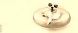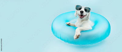 puppy dog summer inside of a blue inflatable wearing sunglasses.