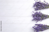 Beautiful lavender flowers on white wooden background, flat lay. Space for text