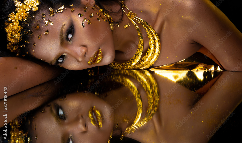 woman apply fashion gold leaf on face head and reflect mirror