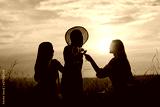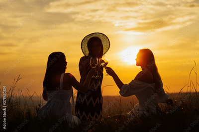 Girls enjoying picnic next to the river. Young friends having fun at hill after sunset. Happy women lifestyle, beautiful relaxed girls on the nature picnic in the rays of the soft sunset sun. Picnic.