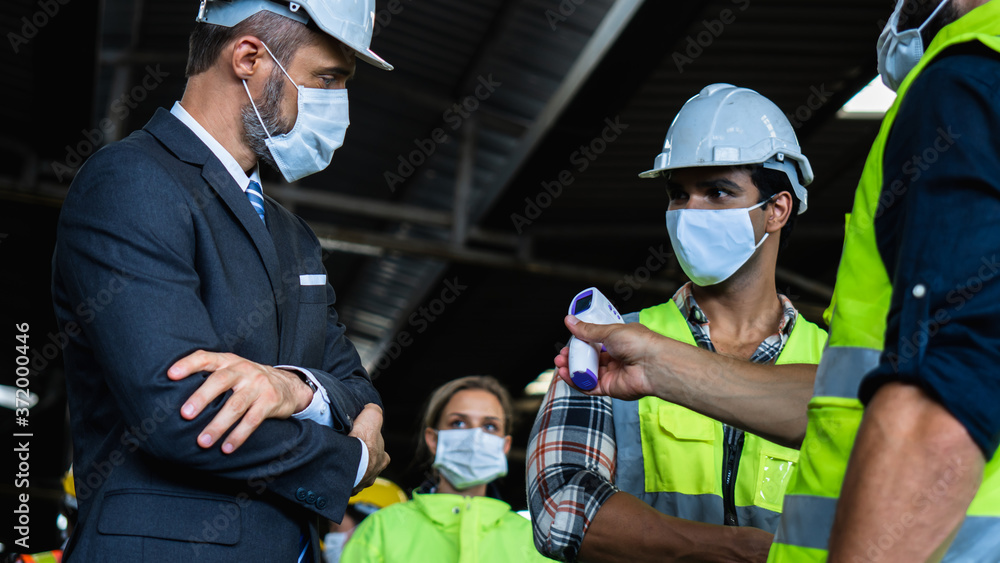 Industrial worker and engineer stand in line to check flu with infrared thermometer and manager control