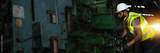 engineer working in handling hard in industrial machine, worker wearing white hard helmet control factory equipment, staff foreman or engineering work with safety concept